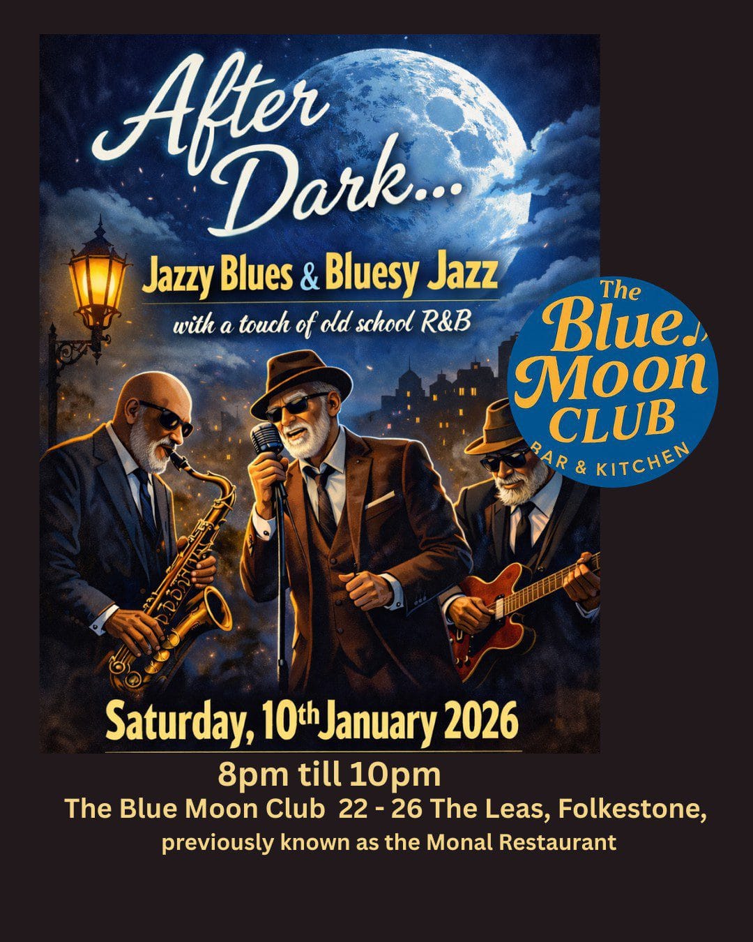 After Dark brings a late-evening blend of jazzy blues, blues-soaked jazz and old school R&B to the Blue Moon Club. Smooth, soulful and understated, this is music for proper listening, rich tones, relaxed grooves and musicianship that speaks for itself.