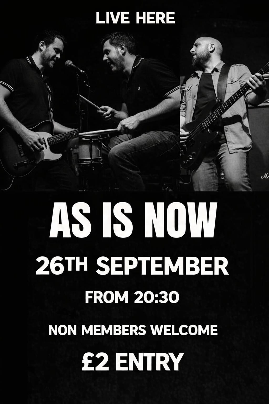 Get ready for a night of electrifying live music at Dover Road Social Club! On Saturday 26th September 2026, the phenomenal band As Is Now takes the stage from 20:30, delivering their signature sound and high-energy performance. Whether you’re a die-hard fan or just love great live music, this is the gig to catch. Everyone’s welcome — non-members too — and entry is just £2. Bring your mates, grab a drink, and soak up the atmosphere. Let’s make it a night to remember in Folkestone’s favourite venue!