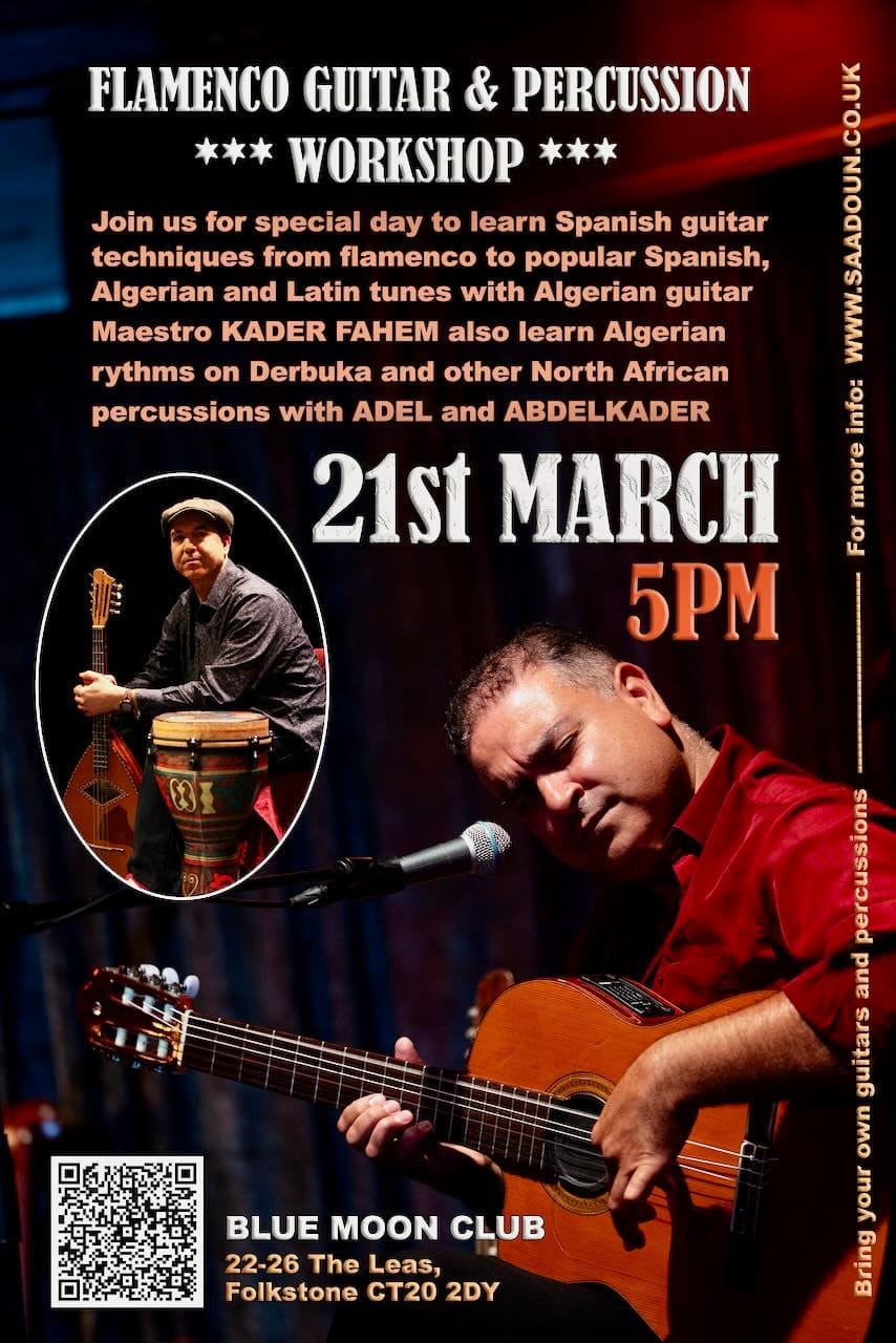Join us for special day to learn Spanish guitar techniques from flamenco to popular Spanish, Algerian and Latin tunes with Algerian guitar Maestro KADER FAHEM also learn Algerian rythms on Derbuka and other North African percussions with ADEL and ABDELKADER.