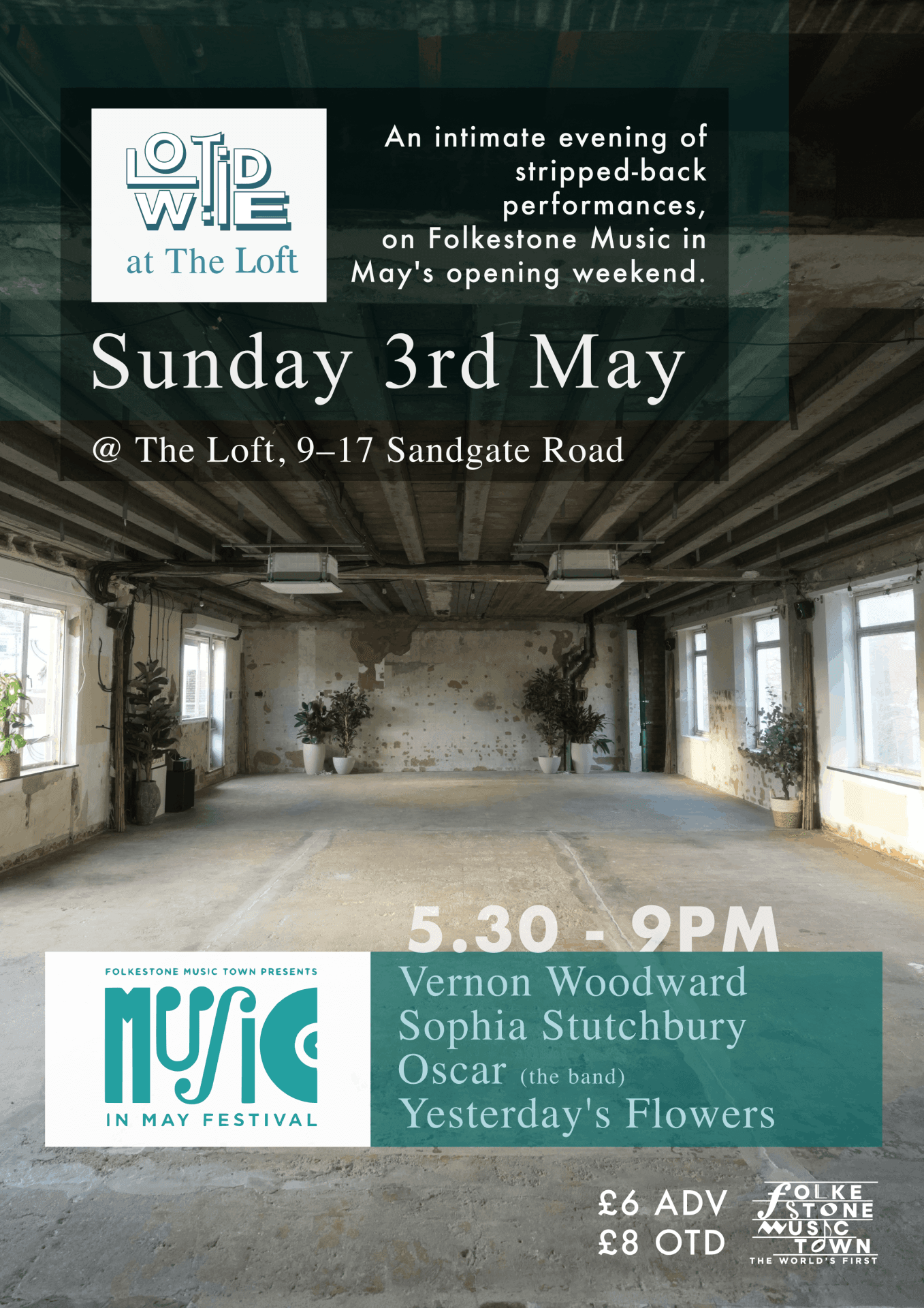 Lowtide invites you to The Loft for an intimate evening of stripped-back live music, featuring some of Folkestone’s most exciting local artists as part of Music in May’s opening weekend. Featuring Oscar, Yesterday’s Flowers, Sophia Stutchbury and Vernon Woodward.