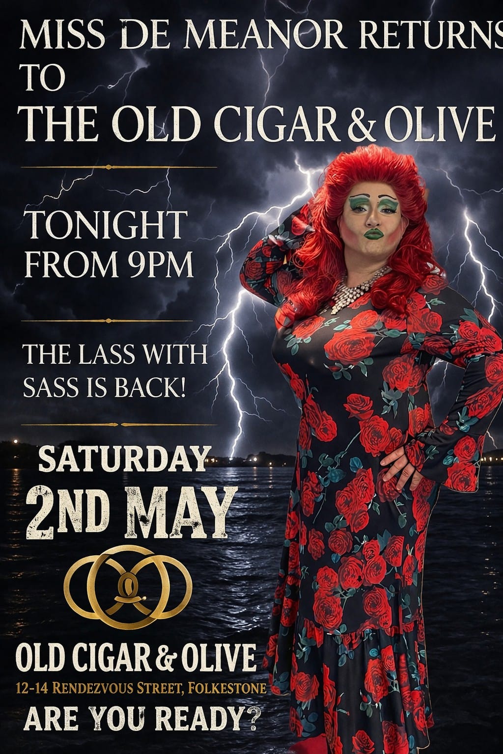 Get ready for a night of glamour, sass, and unforgettable entertainment as Miss De Meanor takes over Old Cigar & Olive on Saturday 2nd May from 8:30pm. Bringing fierce looks, sharp wit, and show-stopping performances to the heart of Folkestone, Miss De Meanor guarantees a night packed with laughs, music, and pure attitude. Whether you’re celebrating or just out for something fabulous, this is your perfect night out. Expect big energy, bold performances, and a crowd ready to party—arrive early and get ready to be entertained!