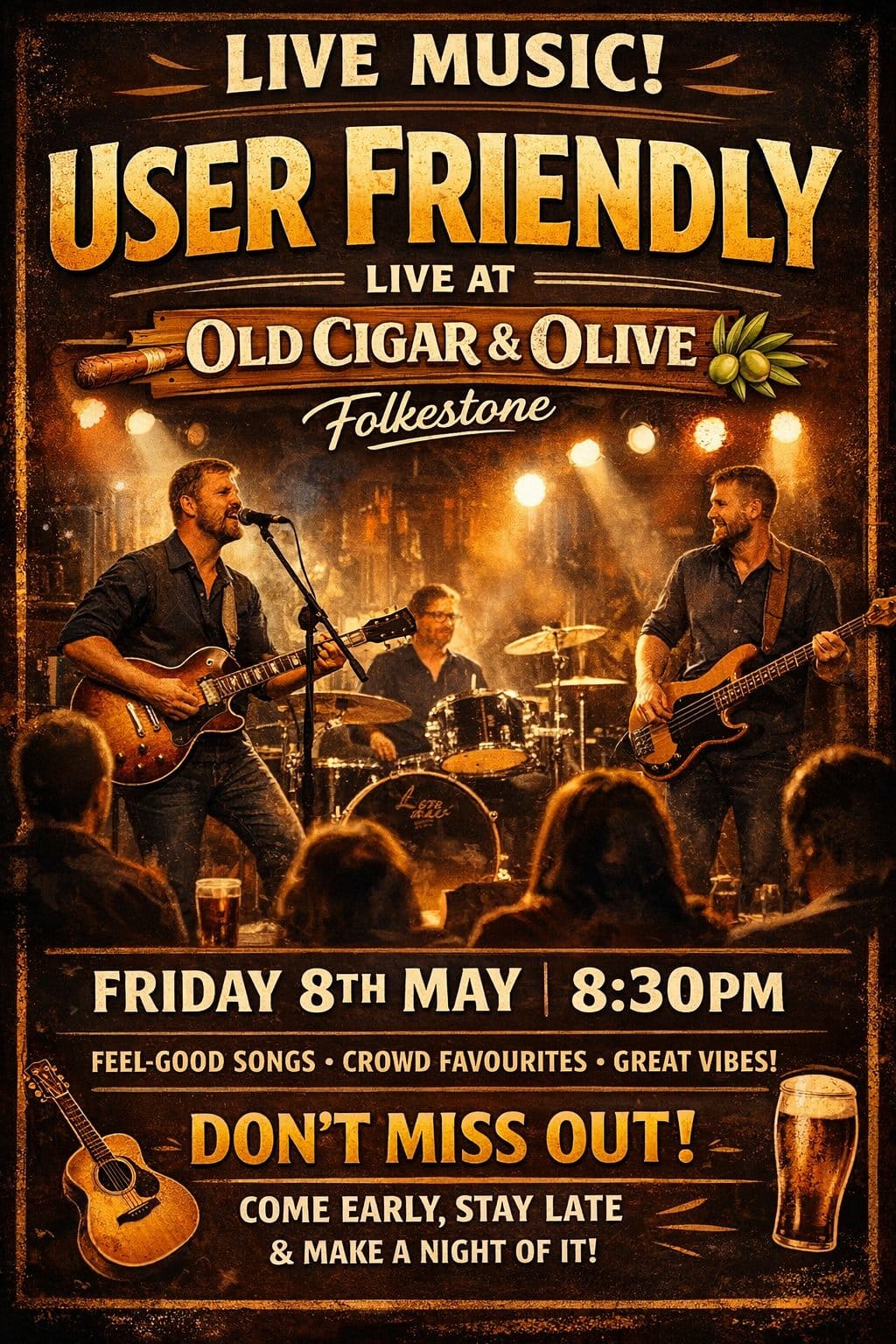 Get ready for a great night of live music as User Friendly takes over Old Cigar & Olive in Folkestone on Friday 8th May from 8:30pm. Expect a lively set packed with feel-good tunes, crowd favourites, and plenty of energy to keep you going all night. Whether you’re out with friends or looking for the perfect start to your weekend, this is the place to be. Grab a drink, soak up the atmosphere, and enjoy an unforgettable evening of live entertainment. Don’t miss it — come early, stay late, and make a night of it!
