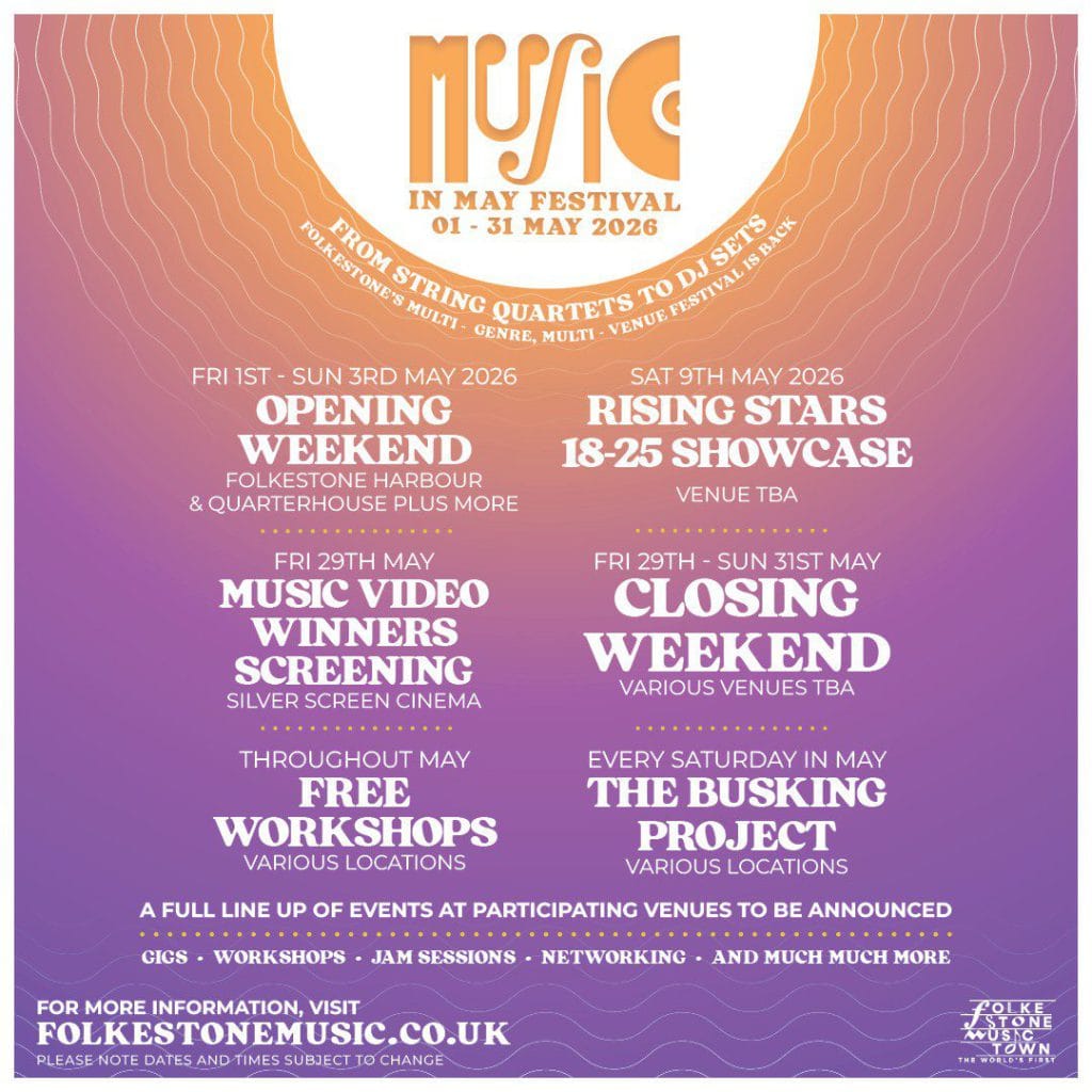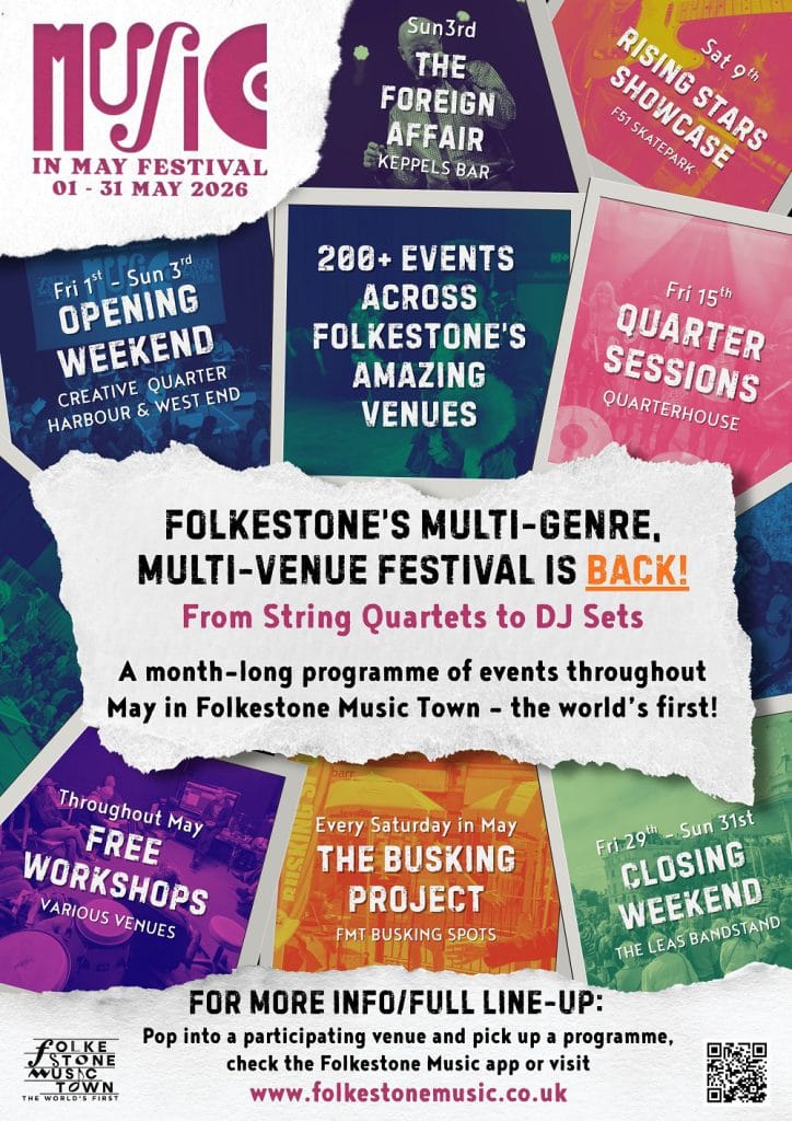 Since 2023, Folkestone has celebrated it’s status of becoming the world’s first Music Town with a month-long festival of all things music. Music In May features gigs, jams, workshops, busking, talks and networking meetings throughout the month, across more than 25 music venues across the town. The festival attracts musical tourism as well as providing opportunities for local artists and musicians to perform and for members of the public to attend free educational workshops.